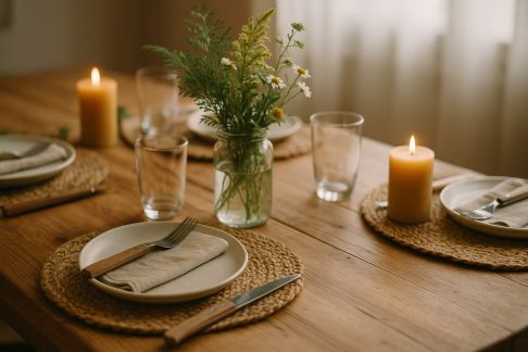 - Nappe foncée : équilibrez par de la vaisselle claire et des éléments lumineux (bougies, guirlande LED).