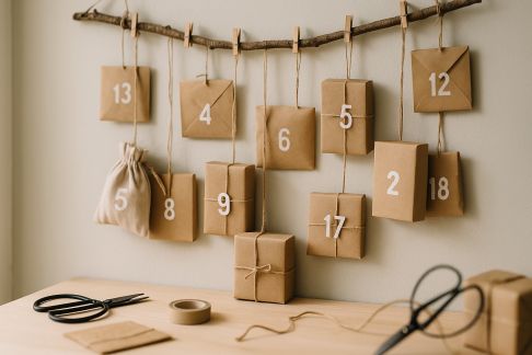 - Pochettes en papier kraft numérotées : À fixer à une corde, à ranger dans une boîte ou suspendre façon mobile autour d’une branche.